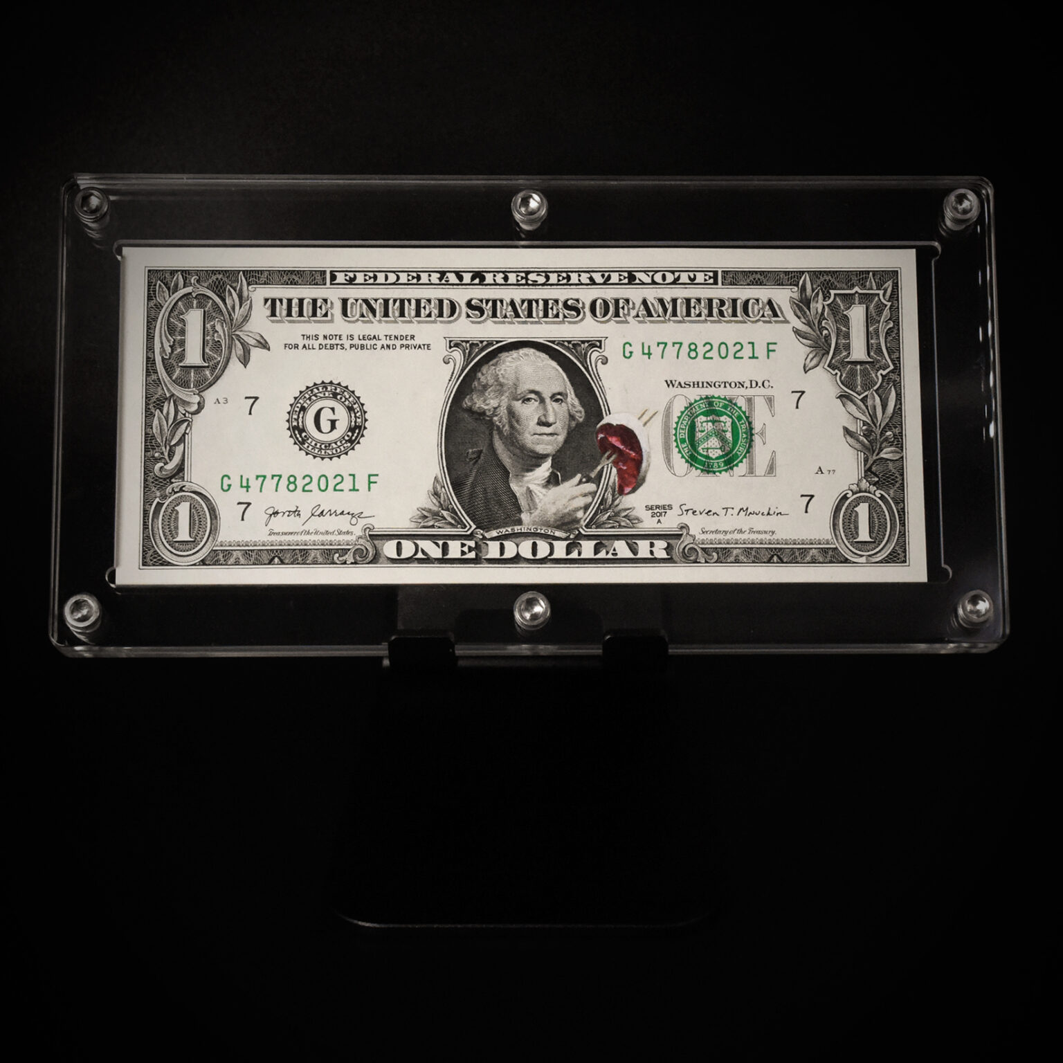 OG connects the enduring value of essential sustenance with the cultural significance of legacy. This series of 1,000 uncirculated $1 bills, each featuring sequential serial numbers, reimagines George Washington holding a ribeye steak on a grill fork. Hand-applied paint ensures that every piece is uniquely its own. On the reverse, a Bitcoin private key loaded with 1,600 sats is safeguarded by a tamper-proof food security label. These sats were funded during the last Bitcoin halving, when 1,600 sats equaled $1.